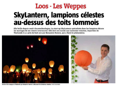 Elle brille depuis 2008 à Euratechnologies. La start-up SkyLantern spécialisée dans les lampions décore les mariages de ses clients internautes. Elle doit son succès aux lanternes volantes, importée de Thaïlande il y a près de huit ans par Benjamin Hamon, qui a flairé le phénomène.” Lire l'article